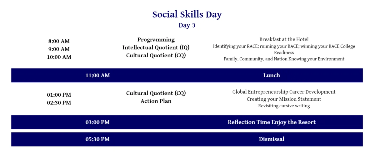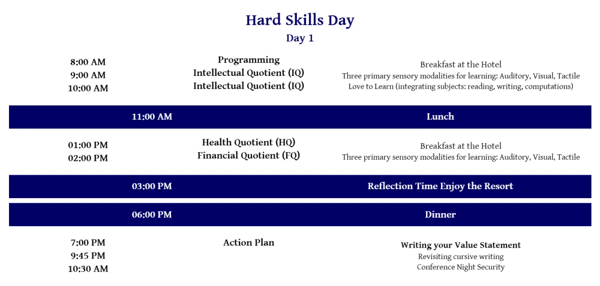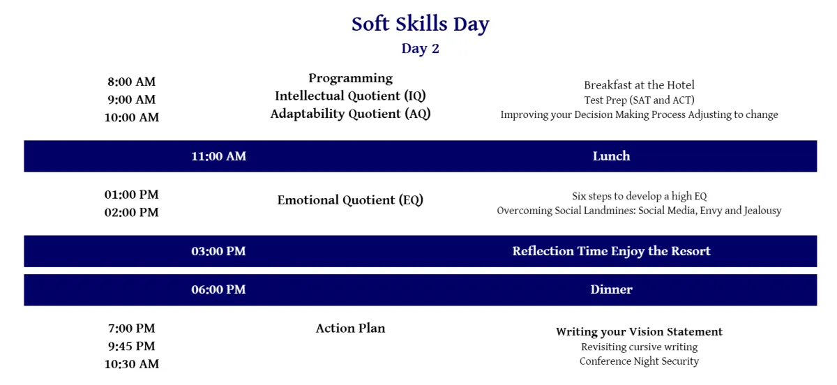 We are excited to welcome you to this transformative three-day conference designed to help students craft their personal and professional blueprints for success. Throughout this experience, we will focus on developing a well-rounded skill set that includes: